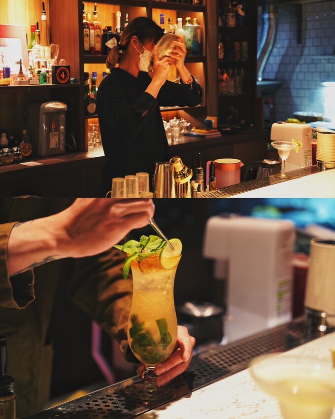 不知道喝什麼,可以試試大眾口味的「Mojito」,上下層分別是黑、白蘭姆酒,可以分開來喝有不同的口感,還有清爽的薄荷香氣及檸檬酸度。「瑪格莉特」是款經典調酒,主要是龍舌蘭酒加上檸檬的香氣,酒感很明顯。「蜜桃烏龍茶」是特調茶香雞尾酒,以紅茶加入伏特加、櫻桃白蘭地、水蜜桃酒及一些果汁,加入食用花來點綴,還帶有萬壽菊香氣,真的是杯果香很豐富多層次感的調酒。