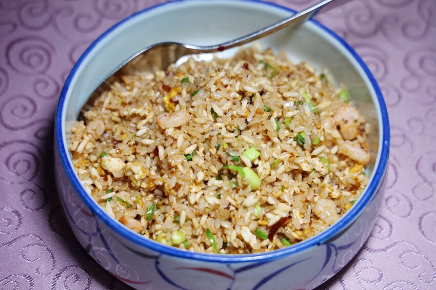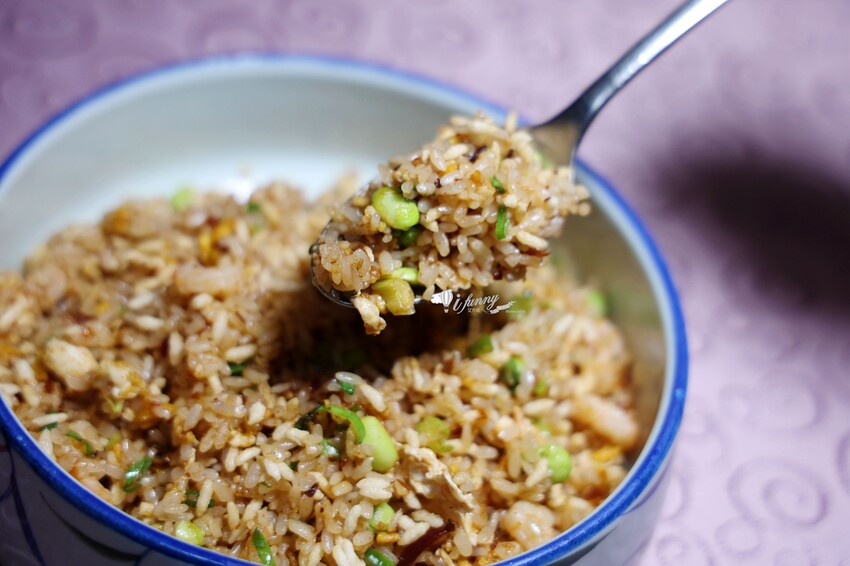 這道炒飯採用兩種米,其一是泰國香米,其二是台灣的台梗九號米。先將泰國米炸過,因此會有米香的脆口感,跟加了蝦仁、蛋等炒飯拌炒,粒粒分明的炒飯,有著不同的香氣及口感,真的超好吃的!