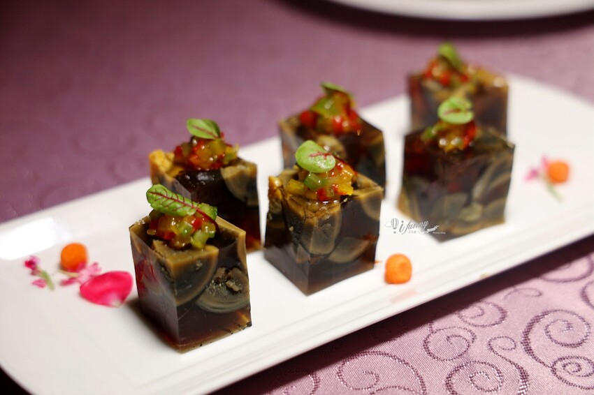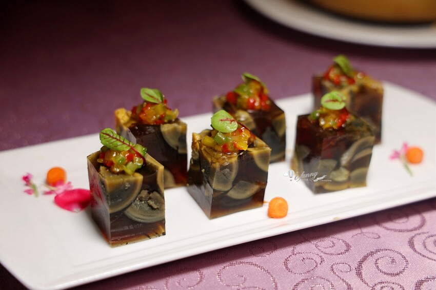 之前在家宴吃到得燒椒皮蛋,是以冰涼的皮蛋及彩色甜椒舖底,再淋以糯米椒製作的沾醬。因應夏天將燒椒皮蛋製成晶瑩剔透的晶凍。切成立體面的皮蛋凍,彷彿藝術品般的美麗。搭配其上的特製辣醬,麻香口感很開胃。