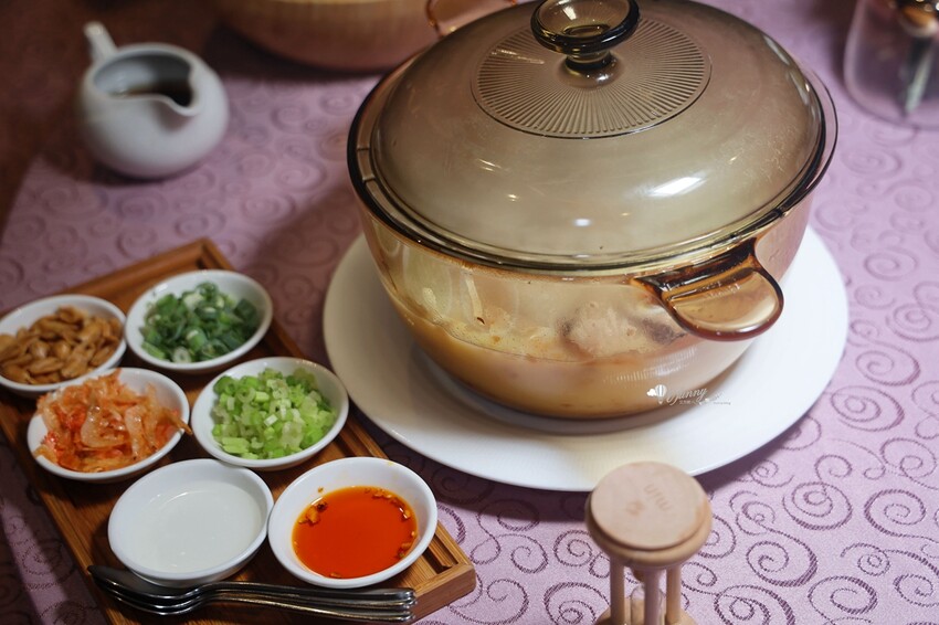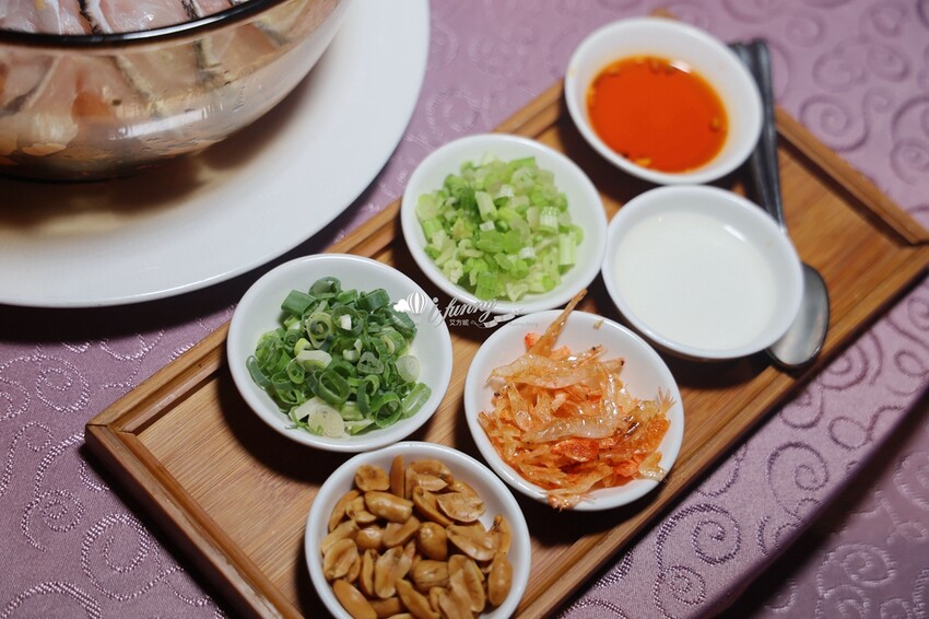 附上的有如鹹豆漿的配料,有蔥花、芹菜末、花生米、櫻花蝦,再依個人喜好加入白醋及辣油。