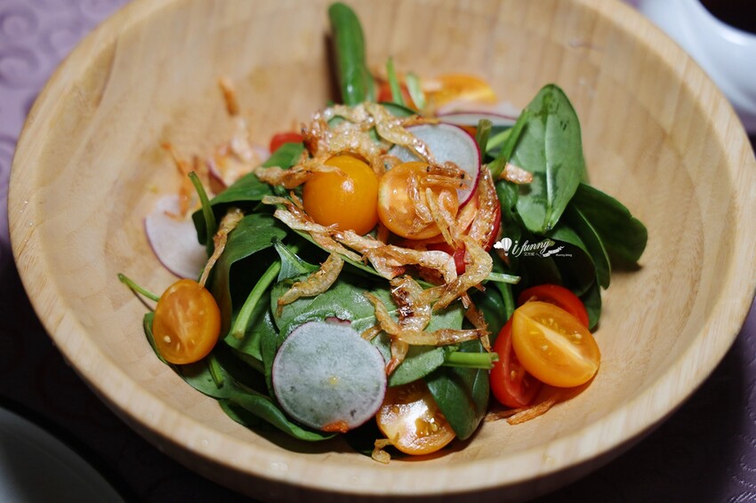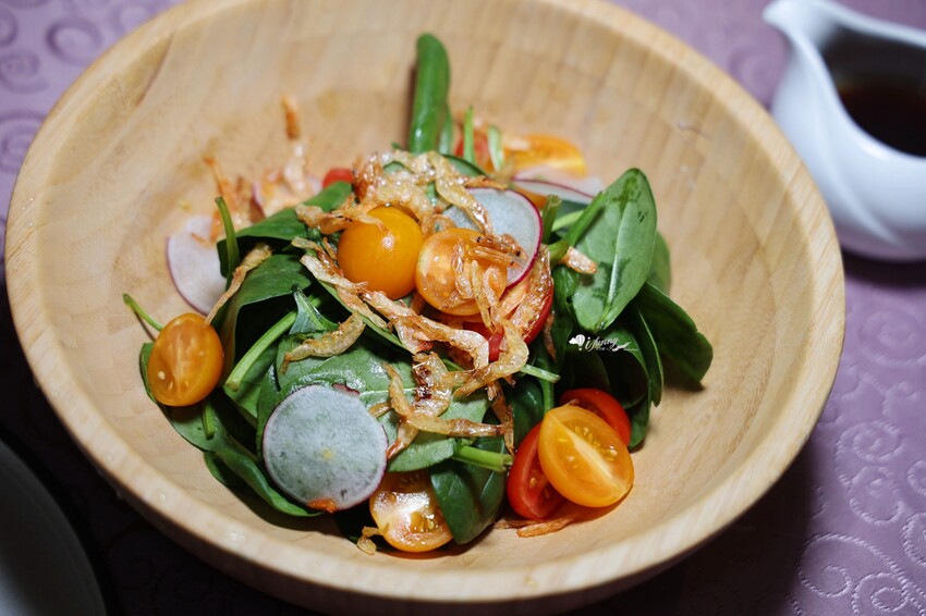 菠菜被譽為「蔬菜之王」,富含葉黃素等多種營養,主廚特別選用鮮甜嫩綠的小波菜,精緻細膩的口感,佐以甜中帶鮮的櫻花蝦,還有增加口感的小番茄、櫻桃蘿蔔,最後淋上主廚特製油醋醬,微酸清爽開胃,滋味鮮美。