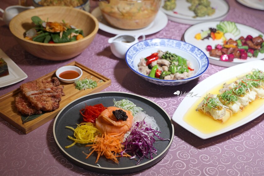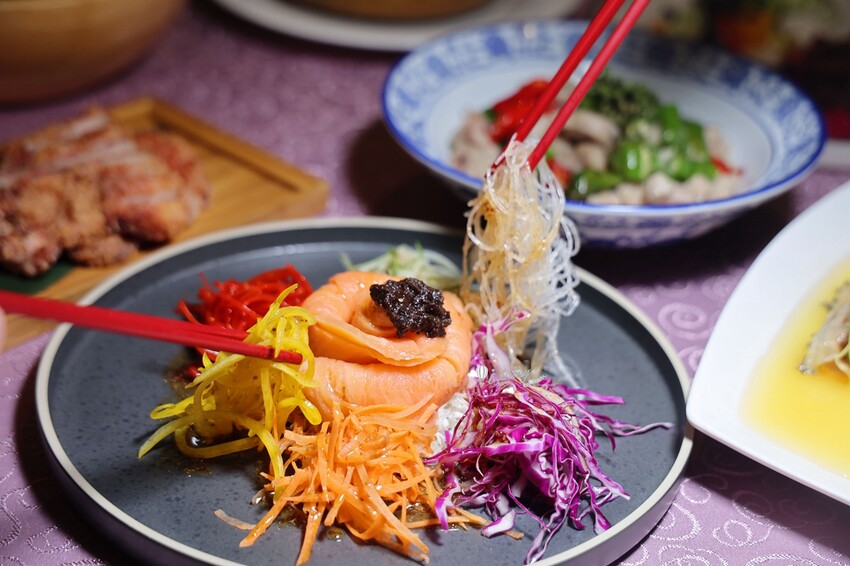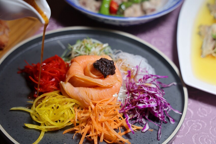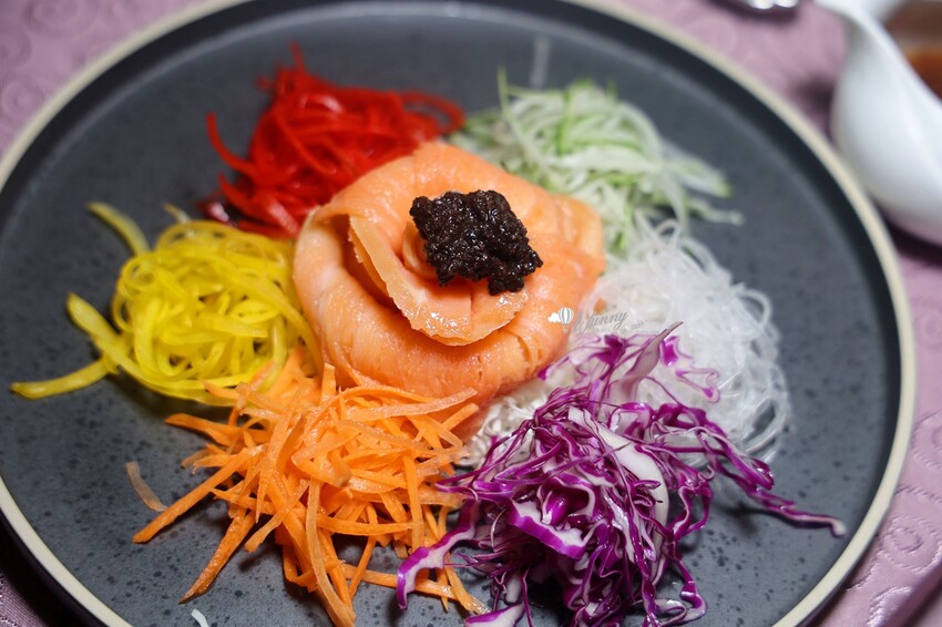 改良粵菜中象徵風生水起好運來「撈魚生」,淋上口感清新微酸的油醋醬,十分清爽又開胃。