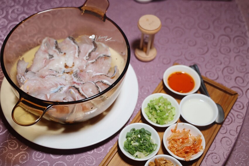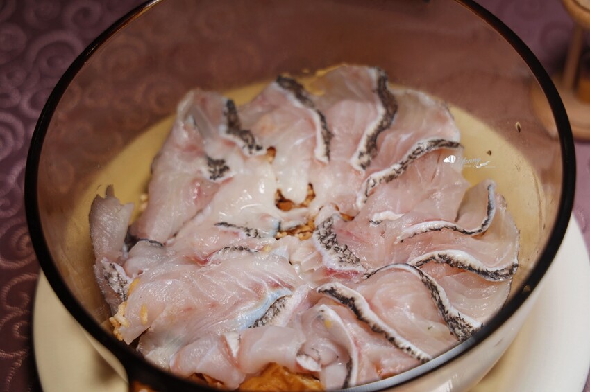 在湯鍋裡先以脆米、油條襯底,其上盛裝滿滿石斑魚片。