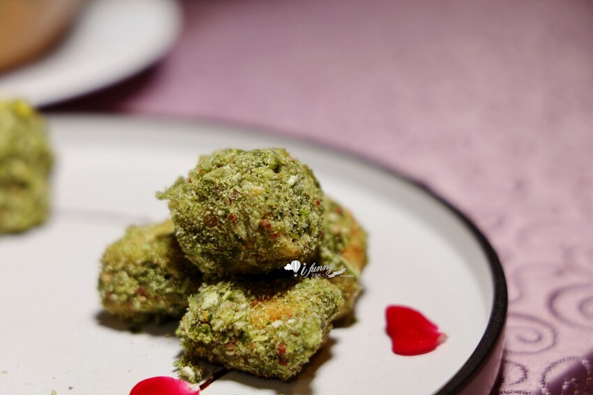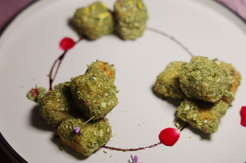 這道料理上桌後,大家都在猜這其外綠色裹粉是什麼?可能是海苔粉或是開心果碎之類的。結果是在銀龍鱈魚塊外面裹上乾燥秋葵磨碎。酥炸過的鋃龍鱈魚,口感很精緻,仔細咀嚼後,哇莎米有後勁,但嗆辣感卻是微微的,很舒服。