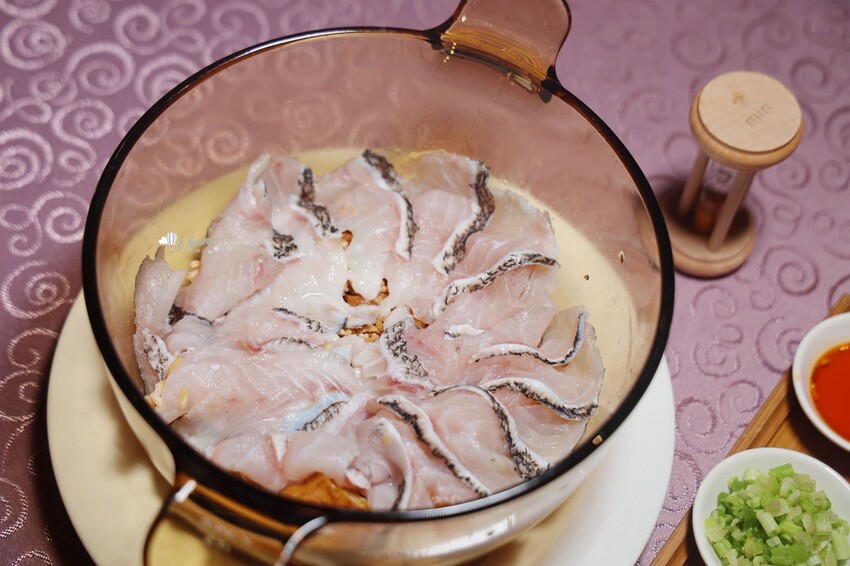 蓋鍋再以沙漏計時浸泡兩分鐘,低溫舒肥保留魚片的鮮嫩美味。