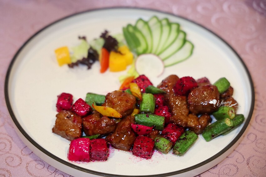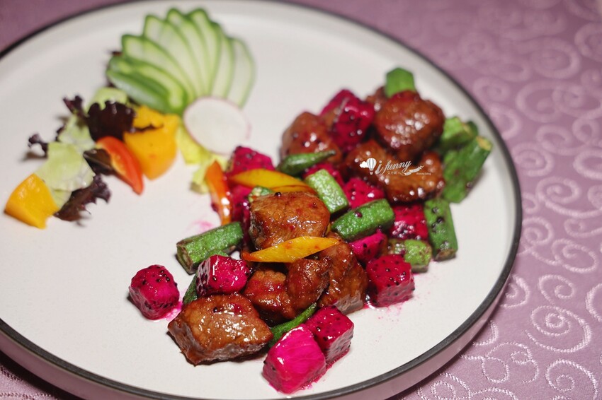 嚴選紐西蘭Prime等級的菲力,以高溫180度酥炸10秒起鍋,表皮焦香酥脆脆,肉汁完美鎖住。酸甜獨家醬汁裹著口感扎實的菲力,佐以富含維他命的秋葵、酸甜口感兼具養顏的火龍丁,替脂香味豐的牛菲力,增添清爽的氣息,令人一口接一口。