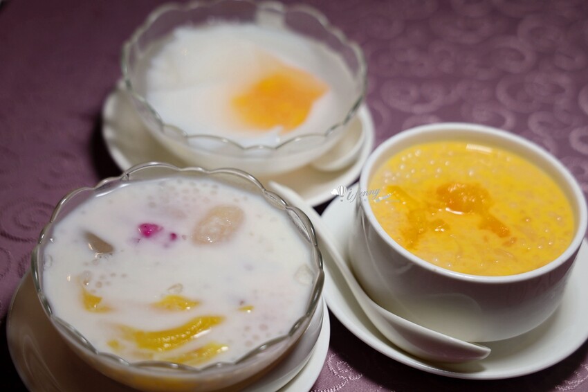 餐後也需要滿足一下甜點胃,我們點了夏日應景的摩摩喳喳、楊枝甘露及杏仁豆腐。