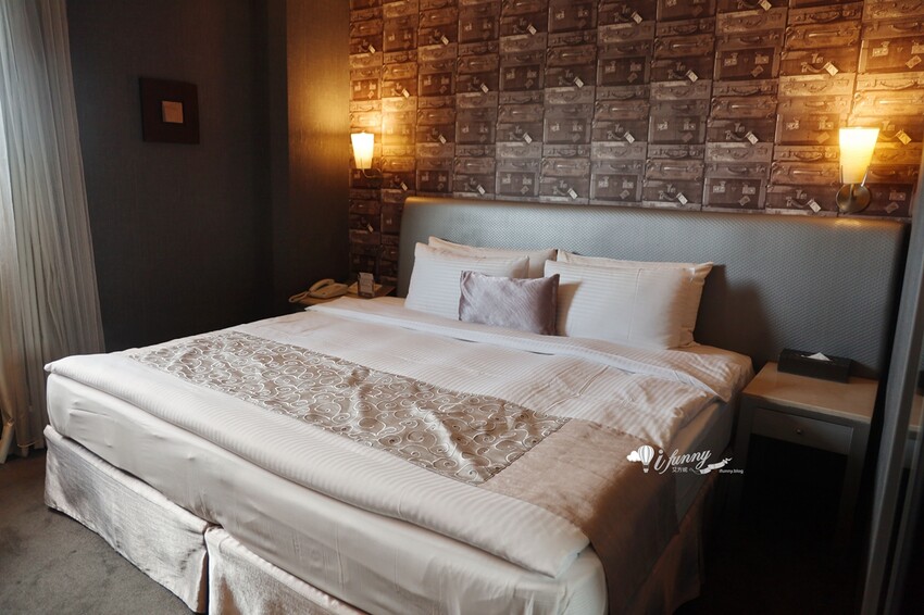 床頭後方是以行李箱堆疊的壁紙,符合了旅行的寓意。