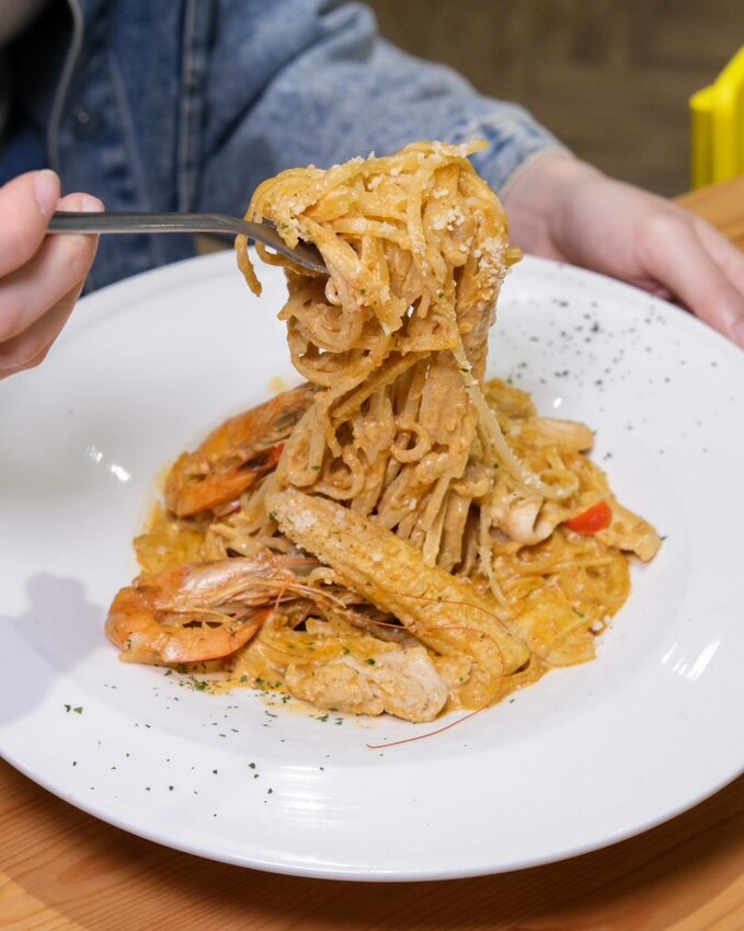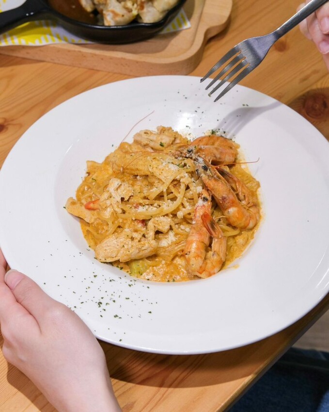 ▼香噴噴的美式塔克鮮蝦雞柳直麵,以墨西哥辣粉融入鮮奶油,打造出微辣濃郁滋味,放入已事先去殼的整隻鮮蝦,還有軟嫩好咬的雞柳,同時選用易吸附醬汁的麵條,每一口吃起來都超夠味 !