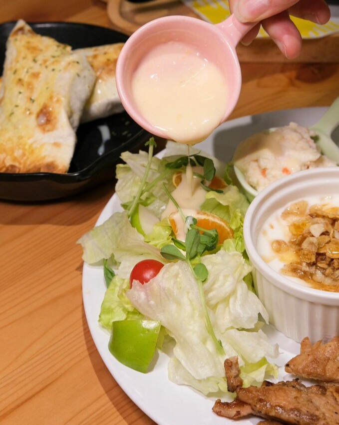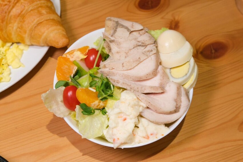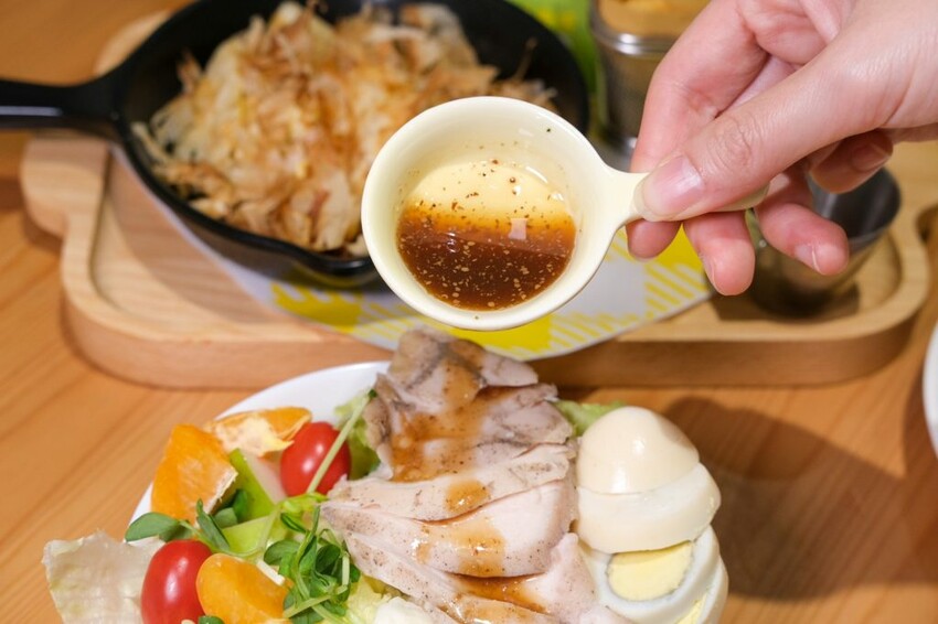 ▼想清爽一點可以吃舒肥雞沙拉,以當季新鮮的生菜為基底,霸氣放上整排舒肥嫩雞肉,再淋點店家自製的優格醬,雞肉咬起來多汁不乾柴,吃起來相當解膩沒有負擔~