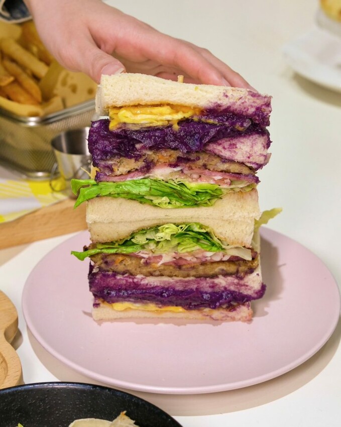▼料多到快爆出來的花生漢堡排歐姆蛋總匯,厚度足足有多達十多層,起司、歐姆蛋、手作紫薯、新鮮生菜交互堆疊,不添加一滴水,以鮮奶和鮮奶油製作的紫薯餡,綿密細緻充滿甜味,讓整體吃起來滑順不乾口!