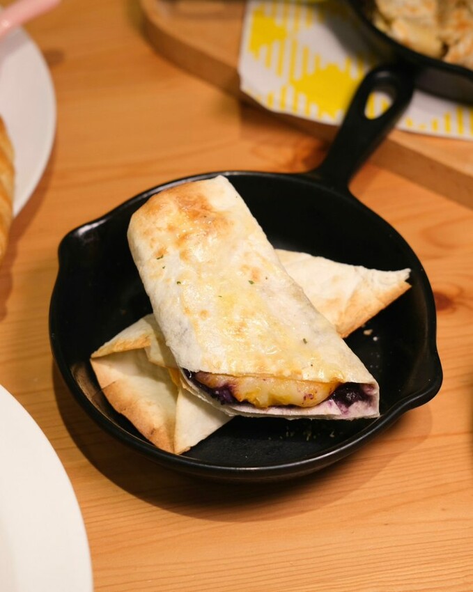 ▼邪惡破表的起司四重奏烤餅,可以選擇紫薯或是芋泥內餡,烤得微焦脆不油膩的墨西哥捲餅,放入四款起司和自製紫薯,再搭配煉乳整個太幸福,才剛咬下去餡料就瞬間流出來,鹹甜的口感超涮嘴~