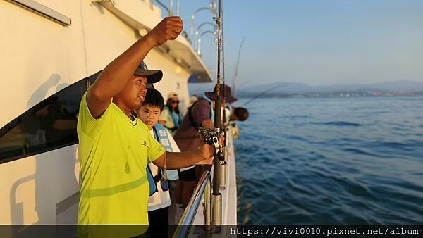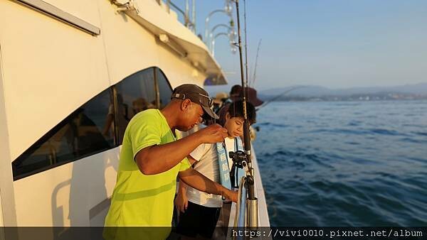 我也跟著興奮起來~~沒想到.....是勾到隔壁叔叔的魚線了,哈!好在工作人員快速的協助排除了這段小插曲