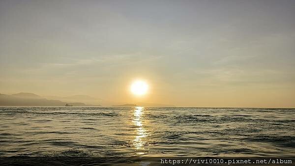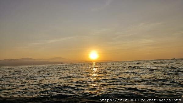 這天的天氣晴朗,橘黃色的夕陽緩緩烙下海面,雖然看過無數次的夕陽落日,但第一次在海面上看