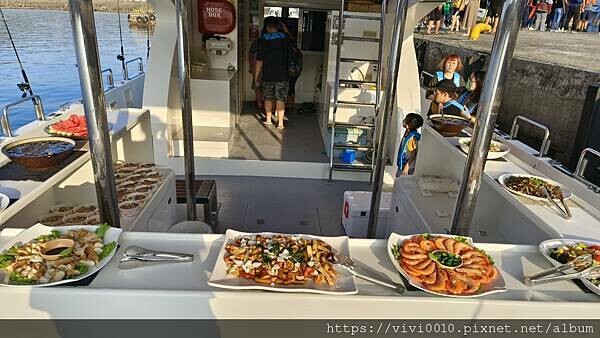 一上船就聞到撲鼻的香氣,傳家準備了豐富的海味美食在船尾,建議淺嘗用即可~畢竟我們要在海上4-5個小時,吃太飽也有可能全都餵大海了