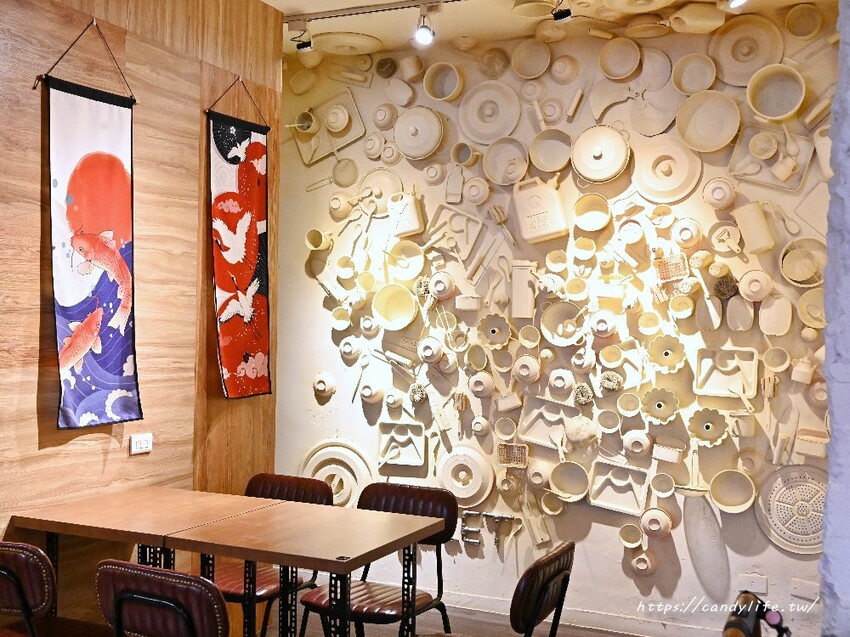 哲本丸。森之丼的裝潢帶有濃厚的日式風格,給人一種充滿溫馨舒適的氛圍,糖糖覺得後面這道牆很特別,採用多種鍋碗瓢盆下去組合而成,看起來還挺有趣的呢