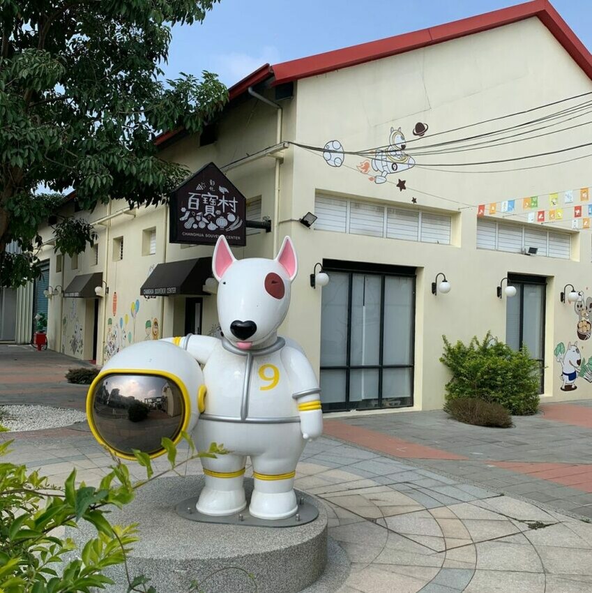 彰化百寶村是彰化的人氣景點,由老穀倉改建而成,本為農產品展示的場館,進行大改造後,換裝成全新的百寶村。在百寶村的門口,有一隻穿著太空裝的「台梗九-賤狗」迎接你,讓人會心一笑。而除了裝置藝術外,淺米黃色為主的建築外型,牆壁還畫上各式各樣可愛有趣互動式彩繪塗鴉,讓你可以借位合照,拍出有趣的畫面。後方整片的彩虹屋,以及彰化的特色壁畫,更是不可錯過的拍照景點。百寶村目前沒有販售農特產品,但是館內有一些文創小物、特色展覽及創意小遊戲,讓小朋友也可以玩得很開心。