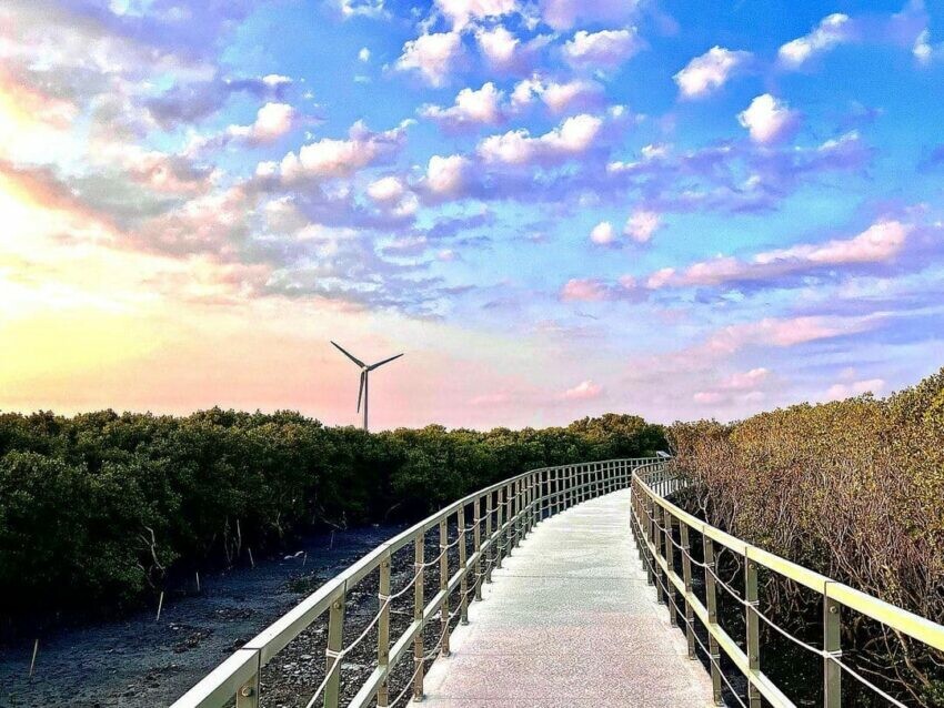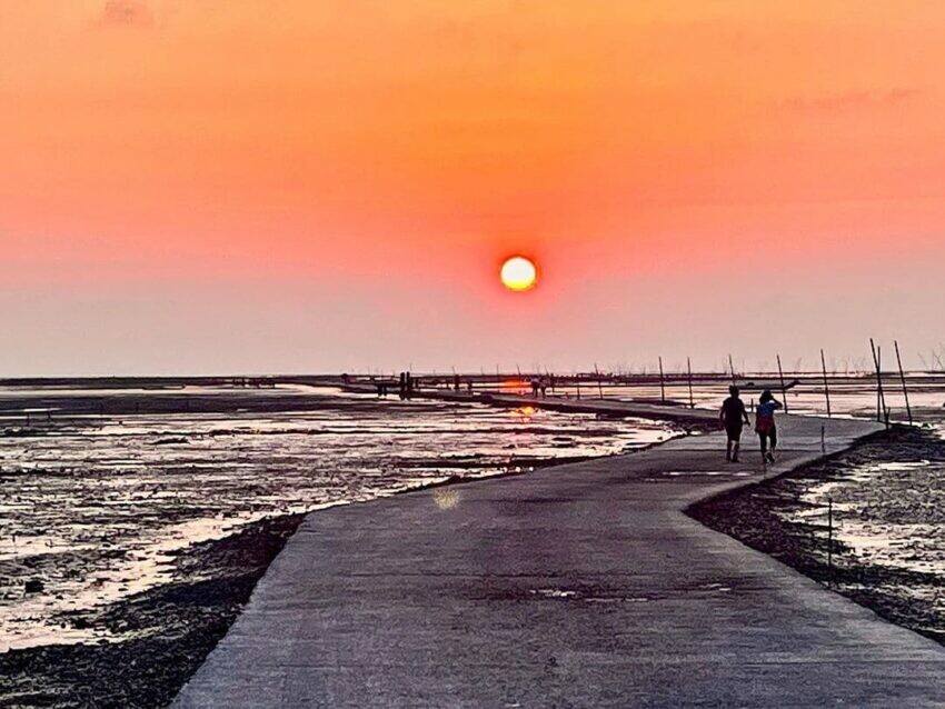 彰化賞夕陽的好去處,就屬芳苑濕地海空步道了。無邊際的夕陽海景,以及綿延一約一公里的純白色海空步道,是看夕陽、親近自然生態的好去處。走在步道上,可以近距離欣賞海茄苳、水筆仔、招潮蟹、彈塗魚等濕地生態,偶爾也有白鷺鷥、或是其他鳥兒從空中飛過。非常適合在傍晚時分,來到芳苑濕地不到這邊,一邊散步、一邊看著夕陽晚霞照應著紅樹林及蚵田的風光美景,享受這美好又浪漫的一刻。
