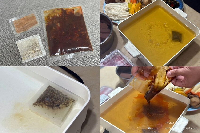 包裝上有QR code連結影像教學,先把不織布包丟入鍋中,配上1800cc的水下去煮,煮滾後再加入油包煮20分鐘,魔鬼椒粉斟酌使用,也可不用,最後就可以放想吃的食材一起煮啦。