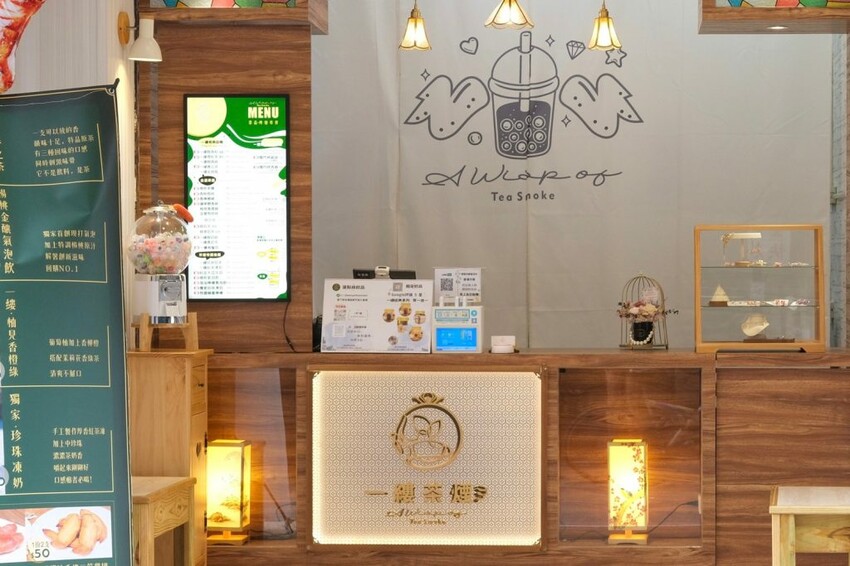 ▼【一縷茶煙·茶品烤翅專賣】以純白色系搭配木質調裝潢,打造出充滿復古華麗的氛圍,美美店面很適合打卡拍照。