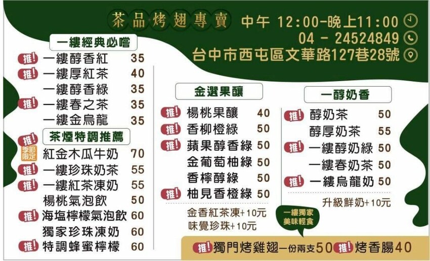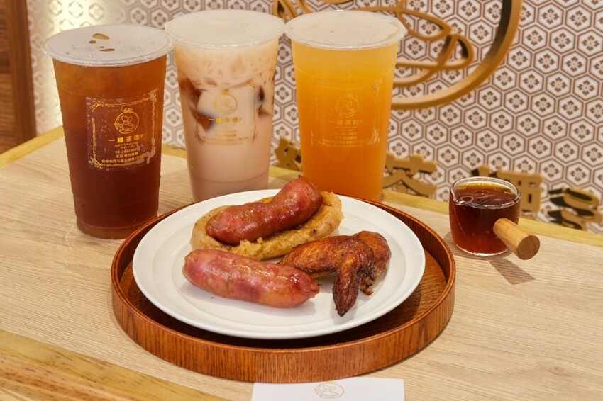 【一縷茶煙·茶品烤翅專賣】以現做的手搖飲為主打,有單茶類、金選果釀、奶香系列、特調推薦等四種,也可以額外添加珍珠、茶凍,或者加鮮奶,還有販售烤雞翅及烤香腸,價位都在銅板價就能買到!