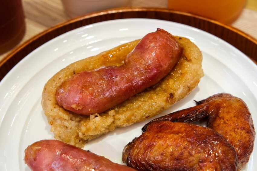 ▼獨門烤香腸這個有在厲害,一咬下去就瞬間爆出肉汁,瘦肉比例較高,口感吃起來紮實有嚼勁,鹹度剛好很耐吃,另外醬燒米包香腸這個組合,米腸加入蝦米、花生、油蔥酥,蒸到軟嫩像是粽子的口感,再刷上蒜蓉醬提味,搭配香腸吃起來超飽足!