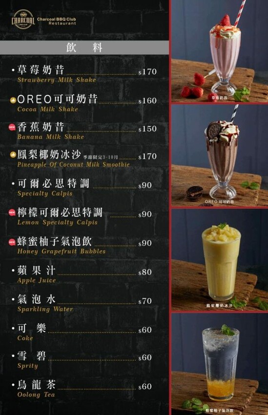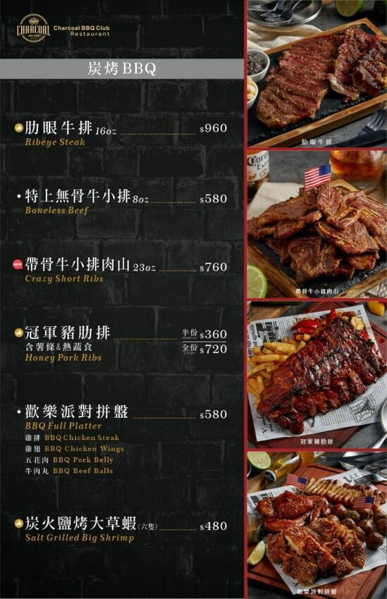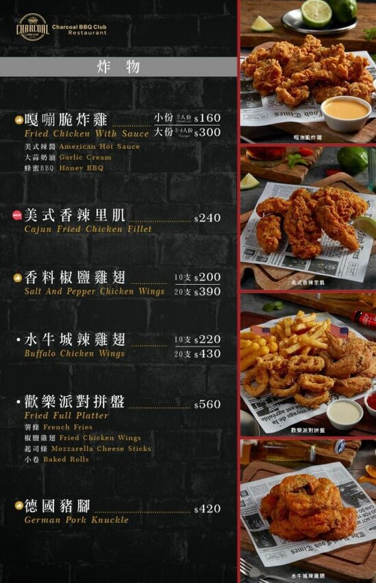 【炭火俱樂部 Charcoal BBQ Club】以美式炭烤料理為主打,還有多種炸物、炭烤BBQ、加州捲、海鮮、飯食、蔬菜、特調飲料及酒類飲品可挑選,餐點的份量都很實在價格不算太貴。