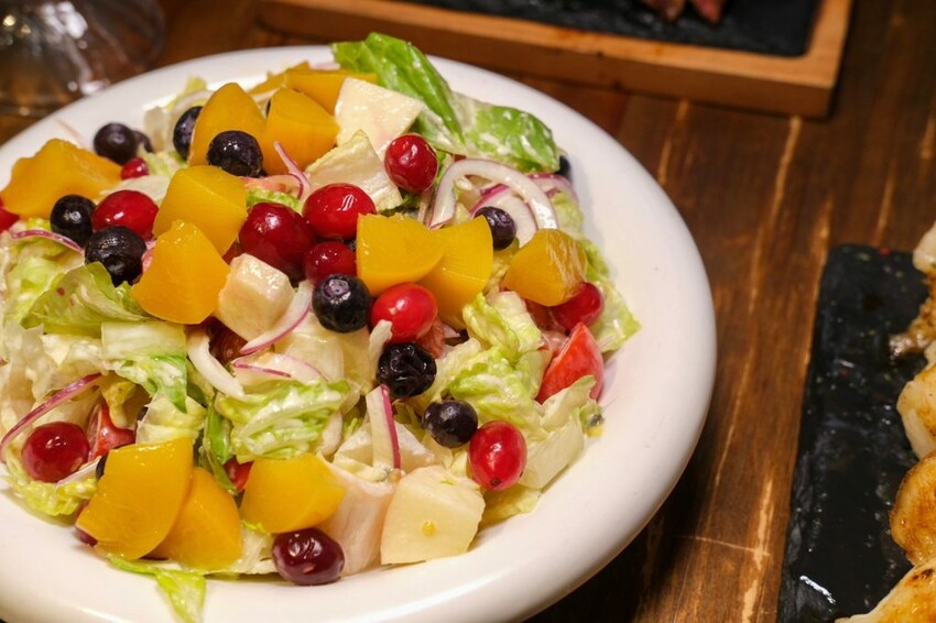 ▼擺盤繽紛的沙拉百香優格,加入藍莓、蔓越莓和桃子水果點綴,再淋上特製的百香優格醬料,酸酸甜甜,爽脆中有著豐富果香,吃起來開胃又解膩!