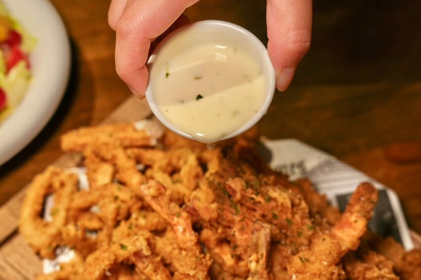 ▼CP值爆炸高的海味雙拼,吃得到炸蝦和小卷兩款炸海鮮,份量超大可以多人一起享用,麵衣是薄脆的路線,咬下去可以感受到明顯的蝦肉感,外脆內軟不會太油膩,推薦可以沾上特製的檸檬醬更涮嘴。