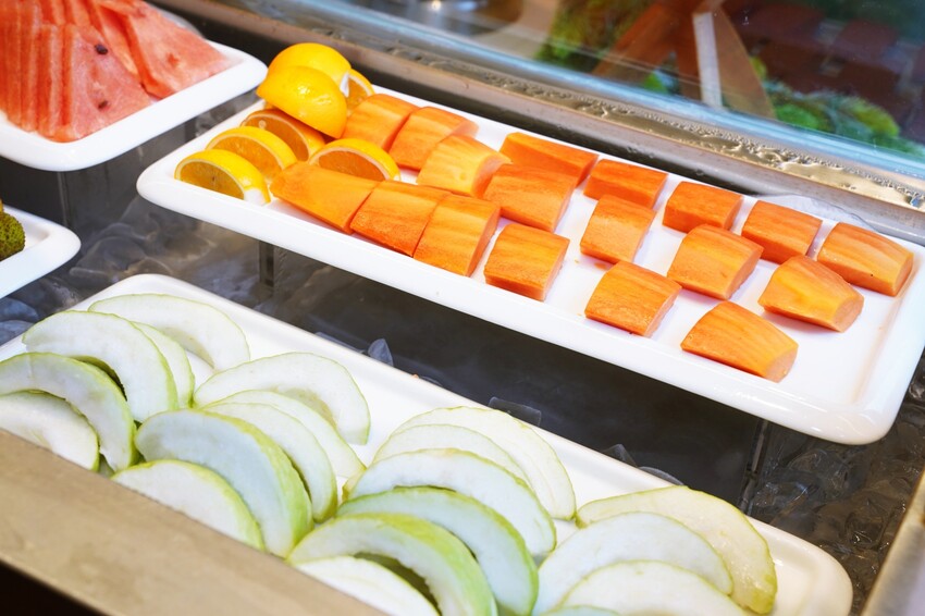 寶島水果區準備了產地直送水果:西瓜、玉荷包、柳橙、木瓜、芭樂。首推吃到飽餐廳不常出現的玉荷包,果肉渾圓大顆、細緻多汁。