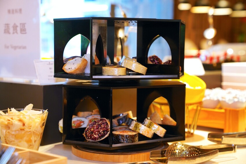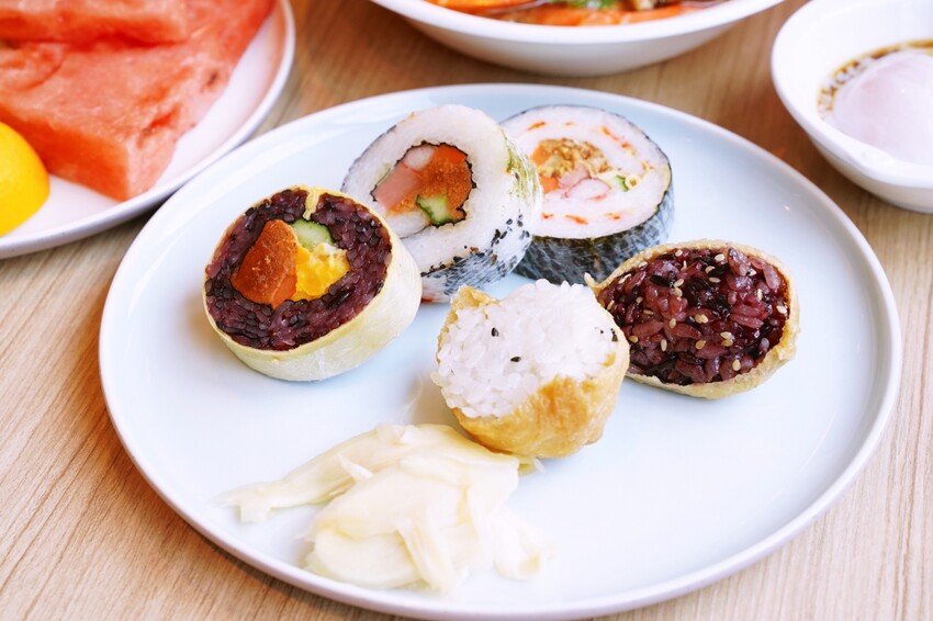 ▼壽司區準備了豆皮壽司、太捲壽司、花壽司。尤其是紫米壽司是注重養生者通常會喜歡的,紫米壽司以烏魚子入料也是有特色的搭配。