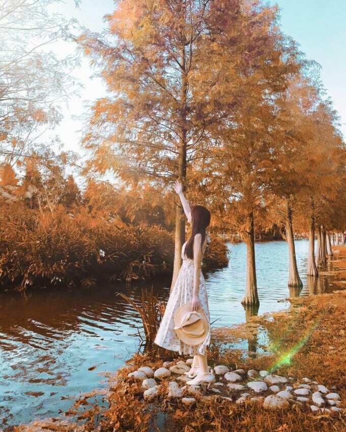 桃園大溪落羽松觀賞景點!月眉人工濕地生態公園為開放式生態園區,園區腹地非常大,免門票即可入園參觀散步。距離入口不遠處的觀湖木棧道擁有絕佳的觀景視野,天氣晴朗的時候放眼望去,藍天白雲和陽光灑落在葉面上的景緻,搭配碧綠的生態湖畔,這樣的美景實在讓人流連忘返!可以沿著生態池走一圈,欣賞沿著生態池種植的落羽松,夢幻、浪漫的氛圍風景,讓人停不下快門,是桃園熱門的情侶戶外景點勝地,一起在這如仙境夢湖般的背景下留下美麗的回憶。>>更多大溪景點推薦