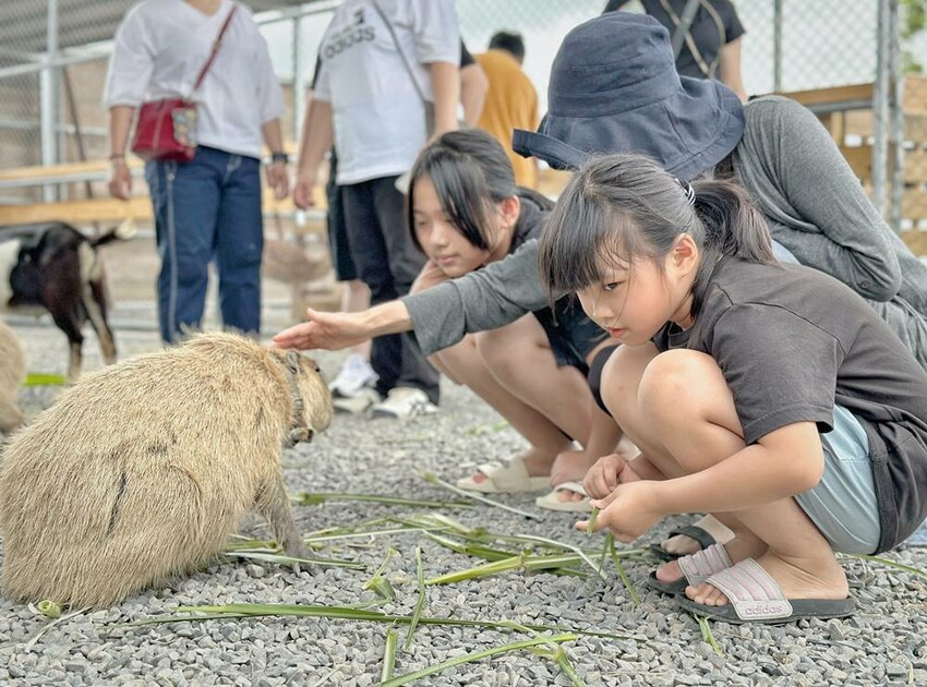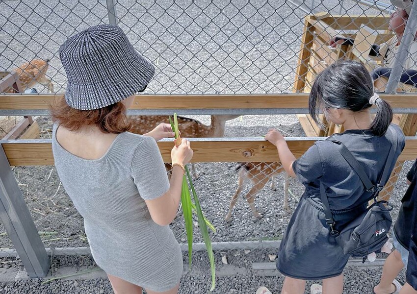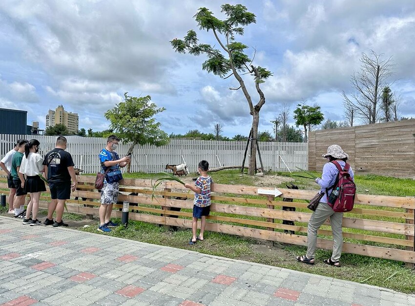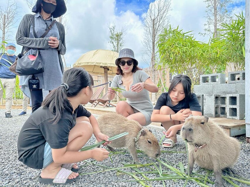 一家五口來訪的Ann和榜哥全家人,當然直接拿門票來兌換5小把牧草來與動物們近距離接觸,原先本來只在小羊區這區餵小羊,接著才找到進入梅花鹿互動區及水豚互動區。來到這區,可直接看到不少可愛的水豚君,而有些熱到去泡澡,有些則是慵懶著等著我們餵牧草給牠們吃,但要記得餵牧草給水豚吃,要剝葉子給牠們吃,較硬的梗牠們是不太會吃的!而梅花鹿互動區不是隨時都可以進去,詳細的開放時間都可以去詢問在場的相關工作人員。