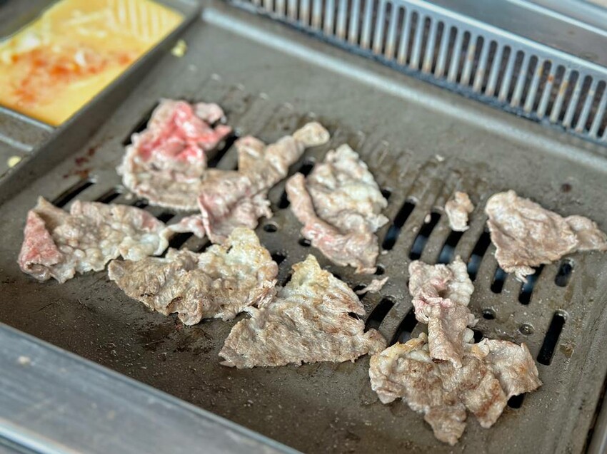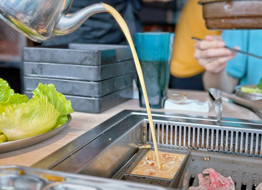 我們都蠻喜歡他們家的泡菜起司烘蛋喔!服務人員會烤盤側邊的格子內倒入蛋液,等到蛋液比較凝固的時候,再用湯匙順著邊邊翻面再繼續烤,我們一連就了好幾份。