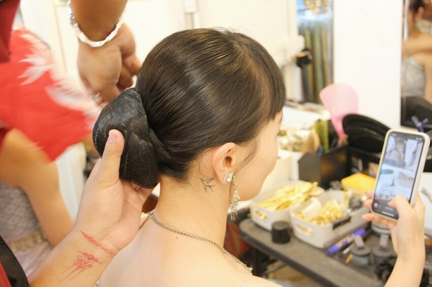 不要以為50泰株的髮型是隨意亂綁,這位髮型師其實會依照你的感覺來搭配髮飾,婗媽原本想要扇形的配件(像身後妹啊那種),被他發現後,他拿在我頭上比了一下示意不適合我,在錄短影片的同時他也很配合的搞笑,真的蠻可愛的!