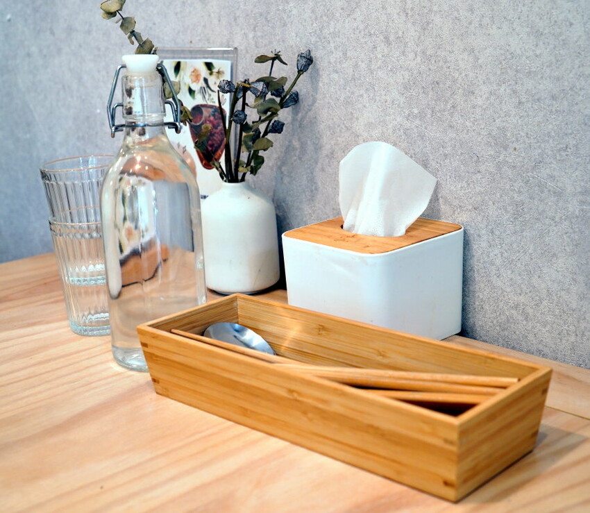 ▼桌子有擺放餐具、紙巾、開水等,另外也有植栽裝飾。