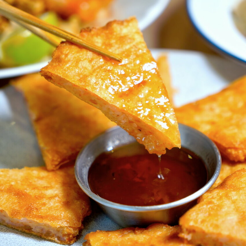 ▼他們家的月亮蝦餅雖然沒有誇張的厚,但吃起來滿剛好~~薄酥的外皮包裹著滿滿蝦泥(詢問店家說是用純蝦泥打的),飽滿又紮實,外酥內彈還帶有鮮美滋味,趁熱吃超美味。