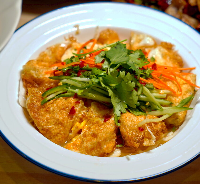 ▼採用炸過的荷包蛋搭配特調泰式醬料,底層舖有高麗菜絲,上頭再以香菜、紅蘿蔔絲、小黃瓜絲點綴,看起來賣相還不錯。