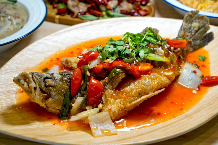 ▼泰式三味魚,將酥炸過的鱸魚淋上特調醬料,整條霸氣上桌,光看就很厲害!