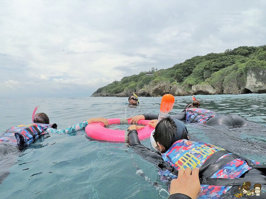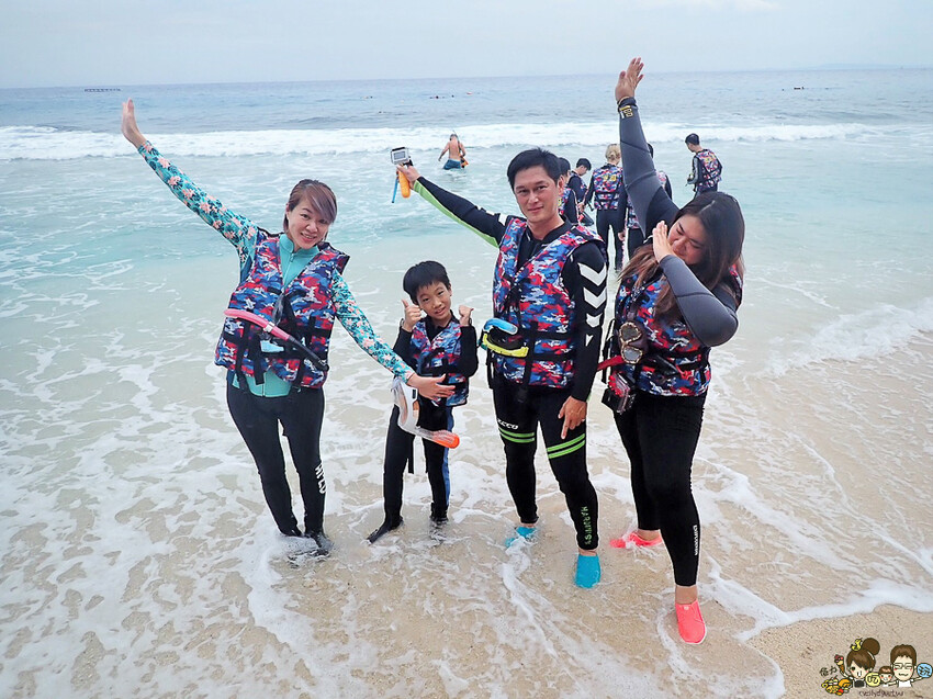 換上浮潛的潛水服裝、救生衣、潛水鞋子、配戴蛙鏡