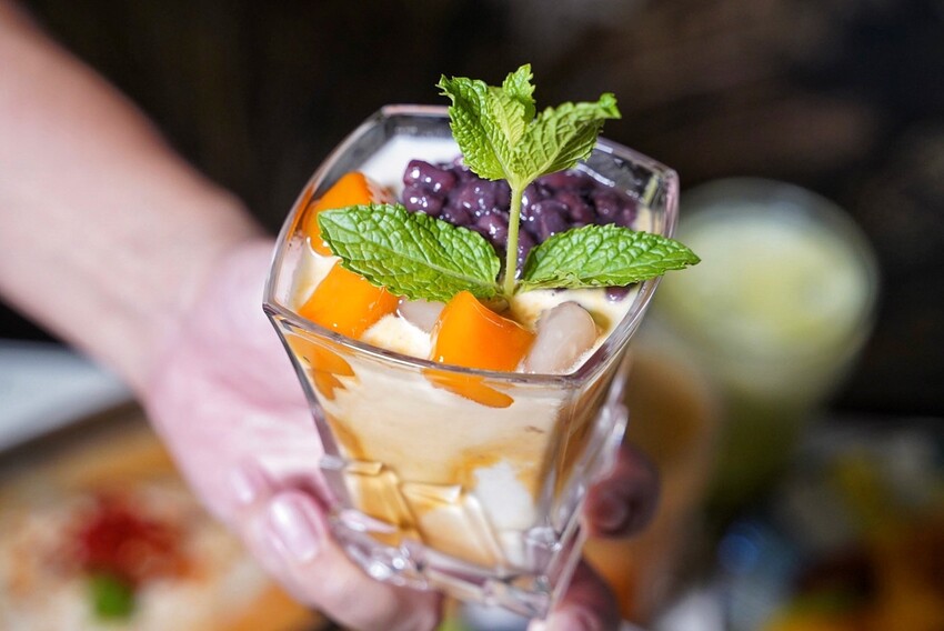 「摩摩喳喳」基底是椰奶冰沙,淋上熬煮8小時的椰糖,再加入萬丹紅豆及九份芋圓,吃起來跟外面的很不一樣,椰糖味道非常香。