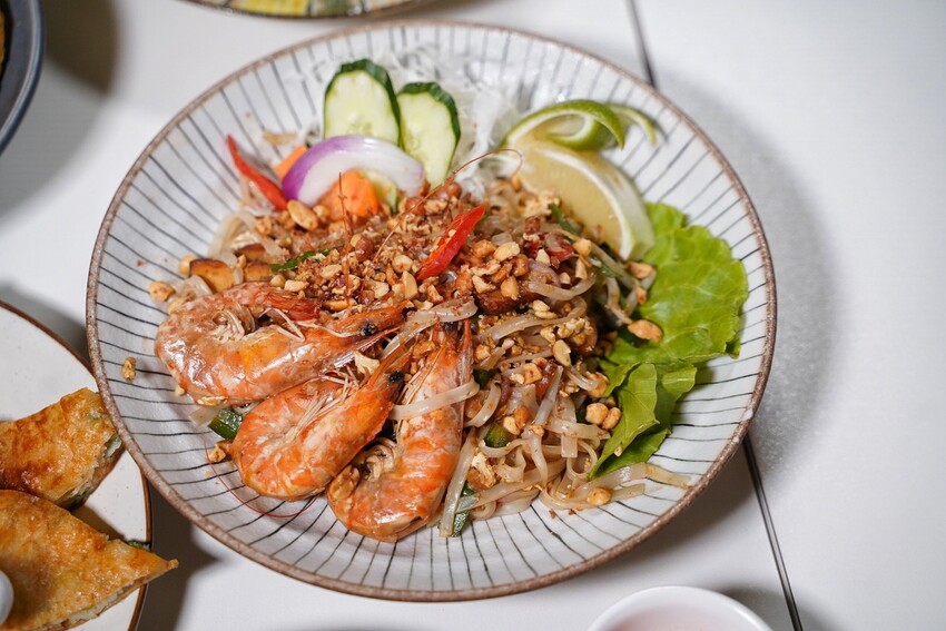 「泰式鮮蝦炒河粉」用料很實在,Q彈的河粉,加入炒蛋、紅蔥頭、花生、豆乾、蘿蔔乾、蝦米,以羅旺子調味來增添天然果酸,鹹香帶點酸度特別涮嘴,覺得不夠酸辣,還會額外給你泰式酸辣醬可自行調味。