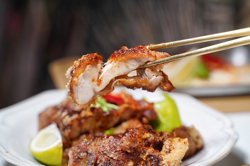 「椒麻雞肉佐泰式醬」雞腿肉以三十二味辛香粉醃漬過,再淋上開胃的泰式酸辣醬,吃起來真的是有夠酥脆有夠香,推薦必點!