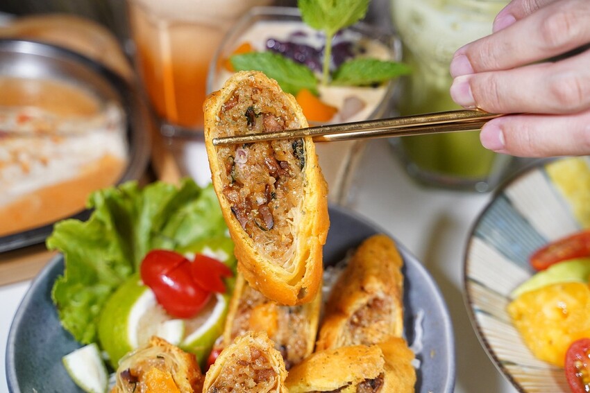 「傳家米糕捲佐泰式醬」結合了臺南當地辦桌美食米糕捲和泰式醬的美味。以豆皮作為外皮,內裡包裹著鹹香的米糕下去油炸,米糕加入了香菇、鹹蛋黃、豬肉燥等多種配料,搭配甜辣的泰式醬,整道菜口感、風味很多層次。