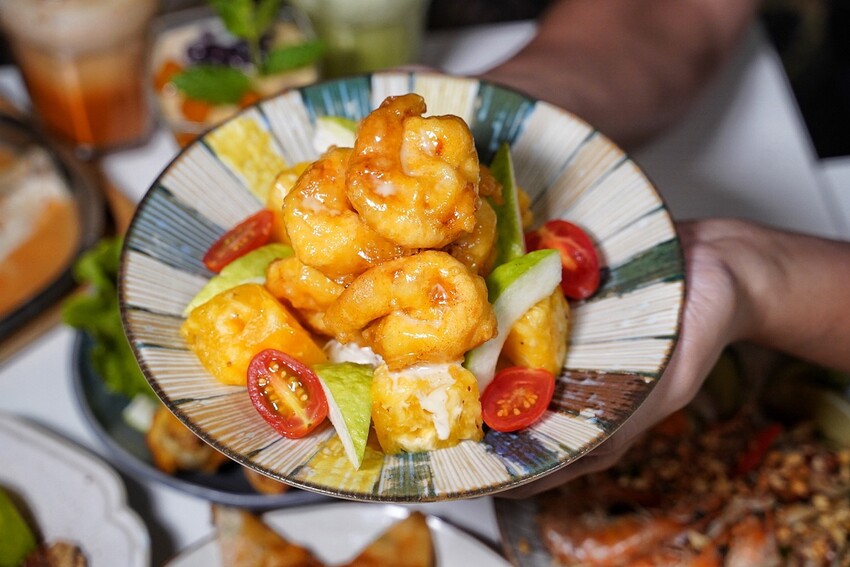 「月亮蝦餅」外皮炸得非常酥脆,蝦仁相當鮮甜彈牙,更還有添加花枝在裏頭,雙海鮮的月亮蝦餅真的好滿足,而且都是店家純手工製作的,附上的泰式酸辣醬很夠味,還特別加入果汁進去,酸甜滋味太開胃啦!