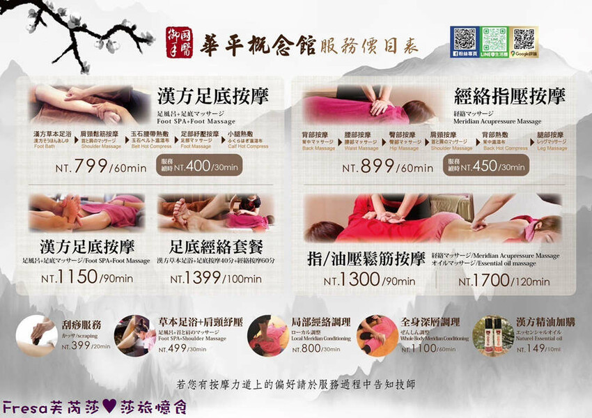 還有油壓鬆筋按摩、足底經絡套餐、漢方足底按摩可做選擇~