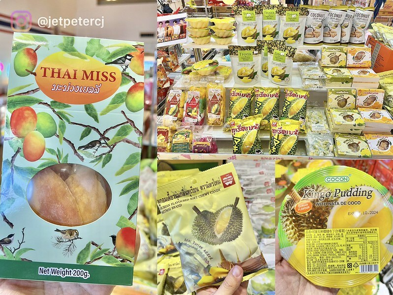 多款水果商品,榴槤乾、榴槤糖、果凍布丁、選擇真的好多喔~芒果、香蕉、山竹、椰子製品,喜歡吃泰國水果的朋友,這裡真的是天堂喔