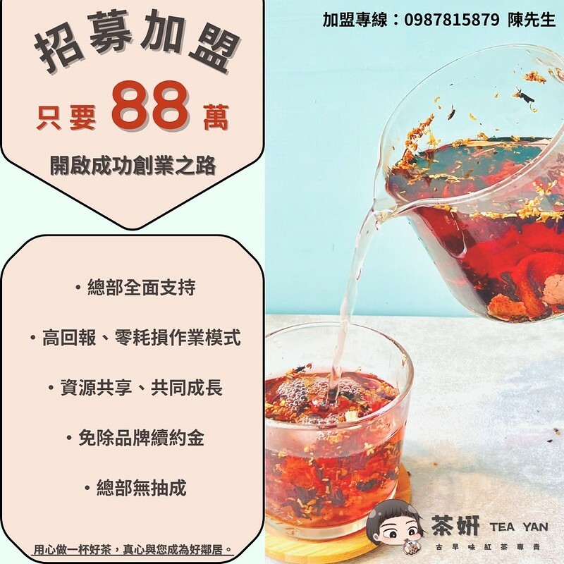 88萬創業自己當老闆,前10間加盟店,總部補助店租金一個月1萬元,補助3個月!這麼好喝的飲料真希望能多開幾家~加盟專線:0987815879陳先生