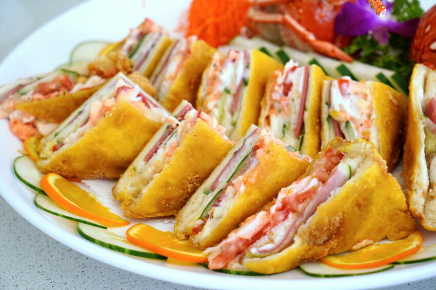 ▼酥脆的吐司外皮包裹著龍蝦肉、火腿、小黃瓜、番茄、美乃滋等多元配料,料多實在又美味。