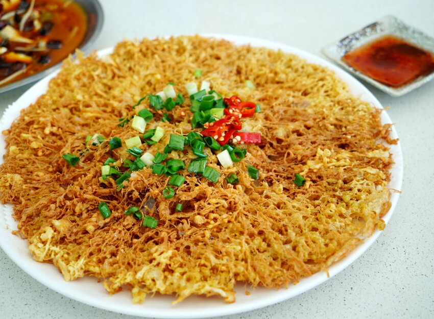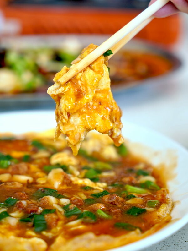 ▼古早味烘蛋,跟想像中的烘蛋模樣不太一樣,烘蛋上頭淋上特製醬料,看起來更邪惡許多。